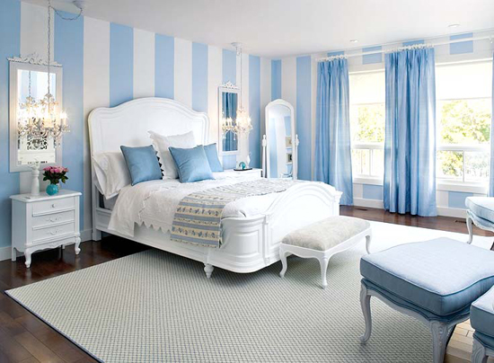 Kết hợp giấy dán tường màu xanh với màu trắng để hợp với mệnh thủy