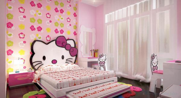 Hay những mẫu giấy dán tường màu hồng hình hello kity cũng luôn là sự lựa chọn hàng đầu của các bé gái. Ngoài giấy dán tường, các ông bố bà mẹ còn dán hình hello kity lên ghế, bàn nhìn căn phòng bé vô cùng dễ thương, ấm áp như là một công chúa thực sự.