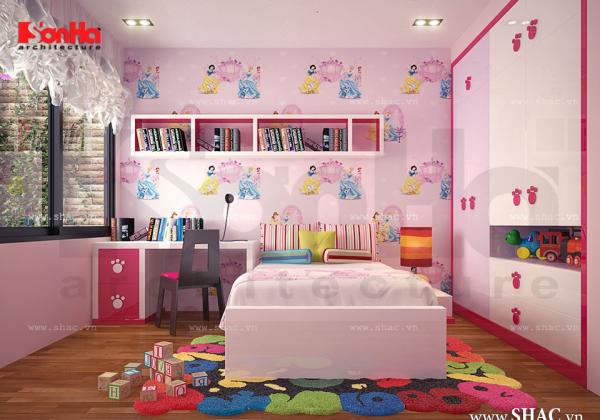 Góc học tập được bố trí trong phòng ngủ yên tĩnh giúp bé có một không gian tốt để học tập. Giấy dán tường có hình công chúa rất dễ thương đáp ứng được sở thích, nguyện vọng của các con.