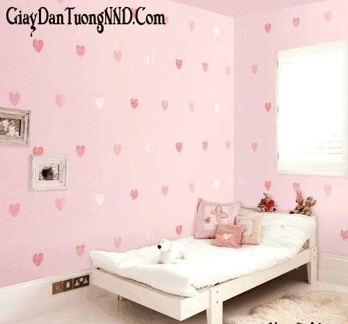 Giấy dán tường màu hồng có thêm họa tiết là hình trái tim kết hợp với ga giường màu trắng tạo sự thanh khiết, trong sáng cho căn phòng bé gái.