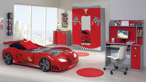 Tủ đồ, bàn học cùng tông màu đem lại không khí trường đua tốc độ.
