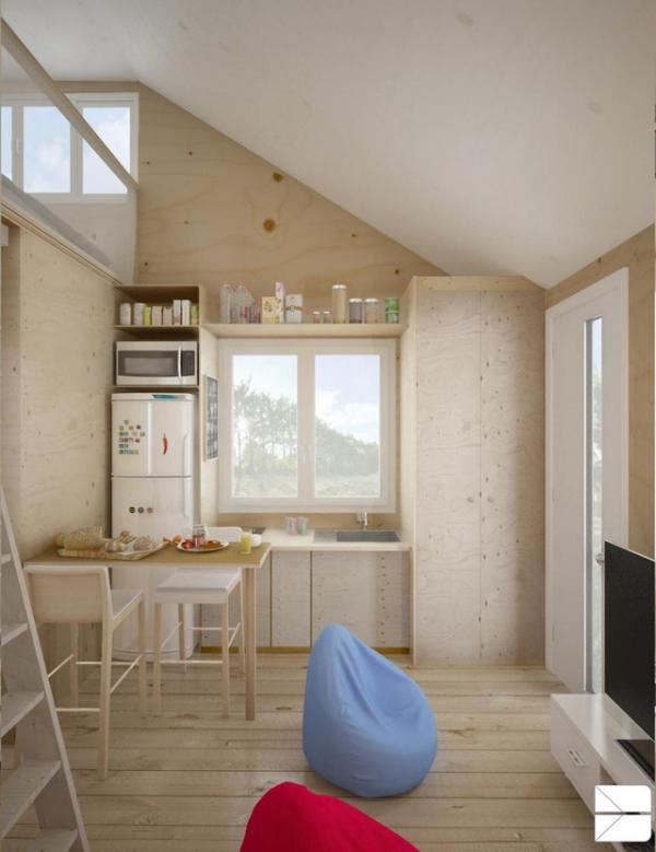 Phòng khách xinh xắn được đặt ngay cạnh bếp ăn nhỏ mang phong cách tối giản với hai chiếc gối lười bắt mắt. Nhờ sử dụng toàn bộ nội thất bằng gỗ sáng màu khiến không gian trong căn nhà nhỏ bé này thêm thoáng rộng hơn diện tích thực.