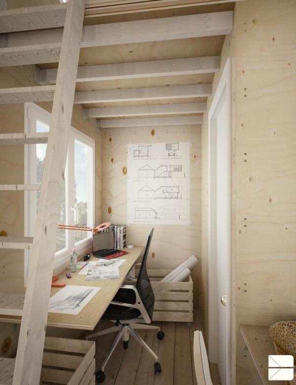 Ngôi nhà tuy siêu nhỏ nhưng vẫn có đầy đủ các khu chức năng khá riêng biệt. Với lợi thế trần nhà cao nên toàn bộ không gian nghỉ ngơi được đưa lên trên vô cùng thoáng rộng. Bếp, phòng khách, bàn ăn, bàn làm việc, khu vực vệ sinh được bố trí bên dưới.